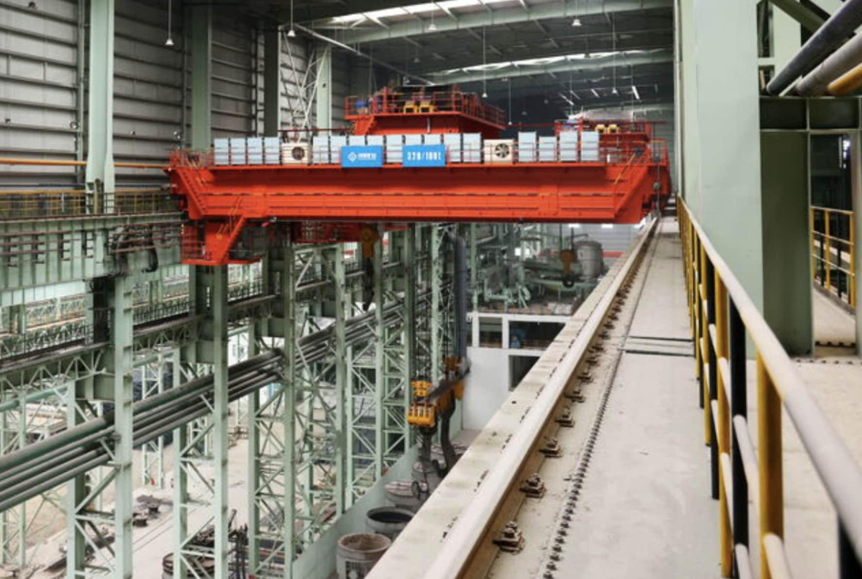 該產品采用四梁四軌雙小車結構型式,主體結構在垂直及水平載荷作用下,具有很好的強度和剛度。大車車輪采用20輪布置方式,力學模型簡單,輪壓分布均衡,可有效降低廠房鋼結構造價。 整機采用調速控制系統,運行平穩、安全,起、制動沖擊小,同時起升調速裝置采用一用一備系統,當一套裝置發生故障時,可實現安全、快速切換,保證起升系統正常運行。 主要零部件采用國內最新最先進技術及制造工藝,車輪組采用最新系列標準45°